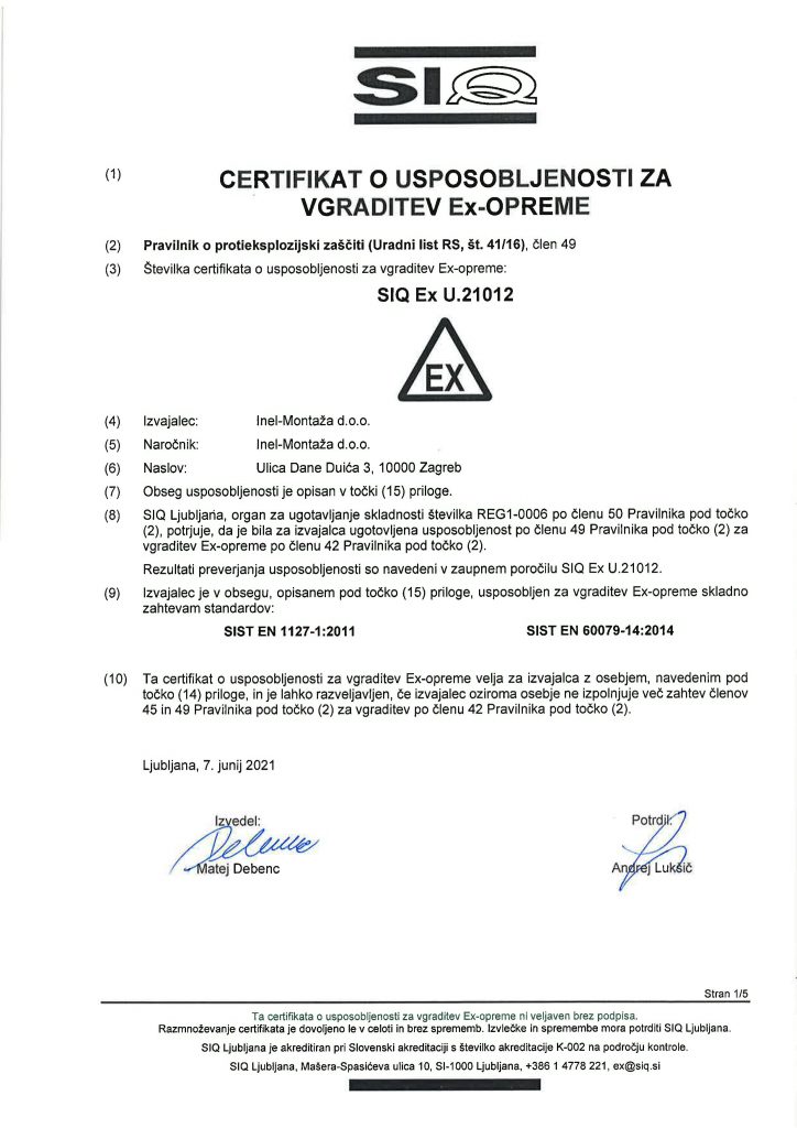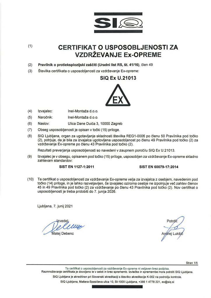 Za aktivnosti odnosno poslove instaliranja i održavanja uređaja i instalacija u prostorima ugroženim eksplozivno atmosferom INEL – MONTAŽA je produžila, odnosno ishodila nove certifikate kod SIQ (Slovenski Institut za kakovost in meroslovje) Ljubljana.